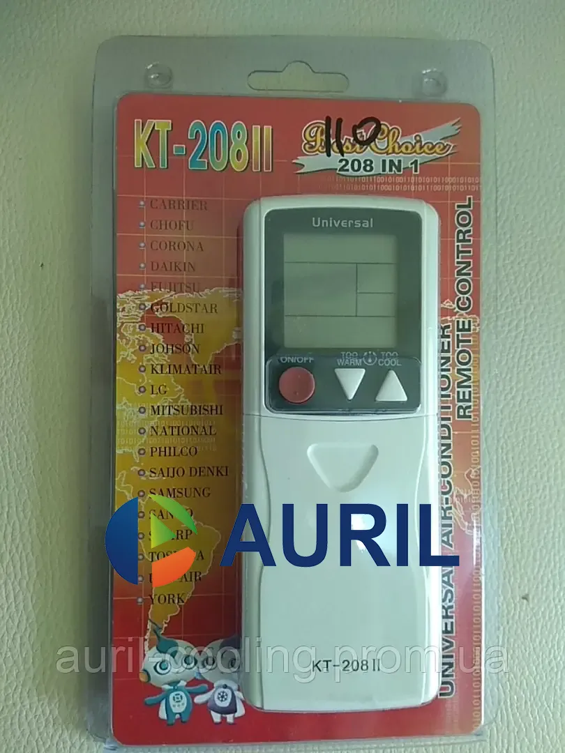 Пульт KT-208 працює з більшістю кондиціонерів, що продаються на ринку. За допомогою однієї кнопки в пульт вводиться код, який відповідає назві виробника. Кришечка на пульті піднімається так, що на увазі залишаються тільки 3 найнеобхідніші верхні кнопки. Такий універсальний пульт замінює пульти до такої техніки як: